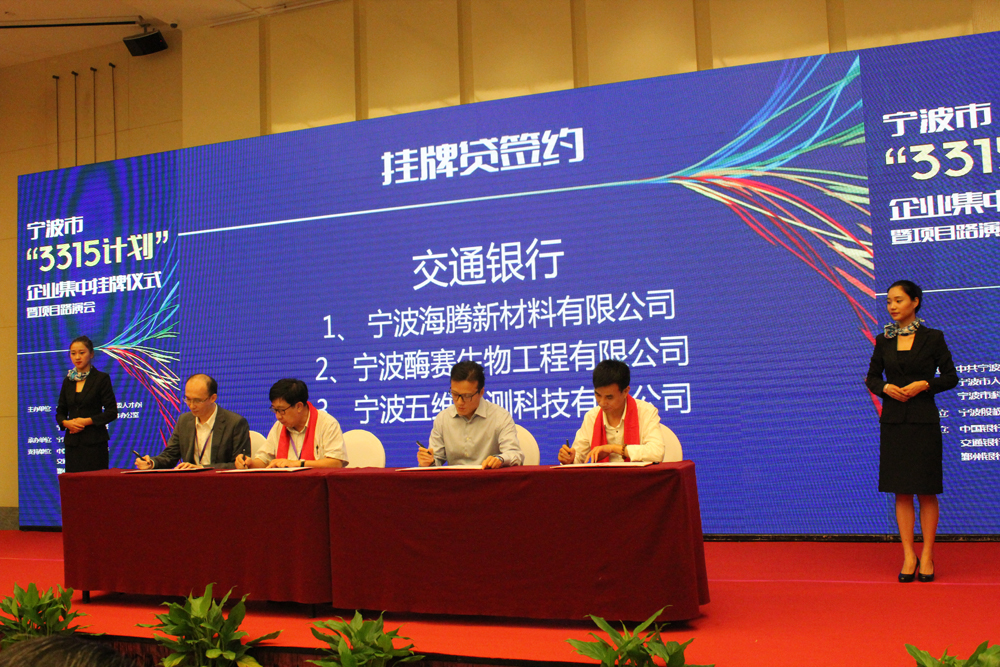 當天共22家“3315”企業(yè)正式在甬股交所掛牌,我司董事長黃勇開博士和總經理呂震林先生參加了此次活動,黃董事長參加了敲響鑼鼓的儀式。下午還舉行了“3315計劃”企業(yè)授信簽約儀式,寧波酶賽生物工程有限公司與交通銀行簽訂了授信協(xié)議。